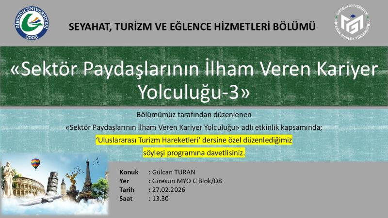 "Sektör Paydaşlarının İlham Veren Kariyer Yolculuğu-3" etkinliği kapsamında; turizm sektöründeki deneyimleriyle dış paydaşlarımız arasında yer alan mezunumuz Gülcan TURAN, Dr. Öğr. Üyesi Hakan BENEK'in "Uluslararası Turizm Hareketleri" dersine konuk olarak tecrübelerini aktaracaktır. Bölüm hocalarının da katılımıyla gerçekleşecek olan bu özel söyleşiye tüm öğrencilerimizi bekliyoruz.