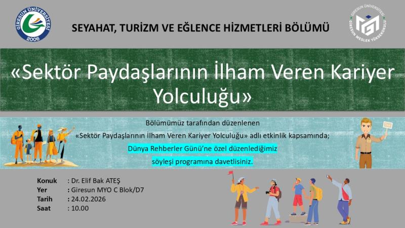 Dr.Öğr.Üyesi Hakan BENEK'in moderatörlüğünde lisanslı bir rehber olan Dr. Elif BAK ATEŞ 24 Şubat Salı Günü saat 10.00'da konuğumuz olacaktır. Tüm öğrencilerimizi bu özel söyleşiye eksiksiz bekliyoruz.
